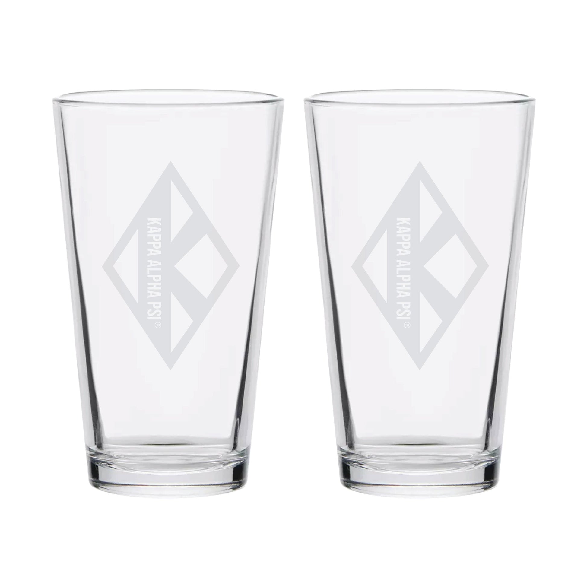 Raise a toast with this Set of two 16oz Pint Glasses. Each glass features sand-blasted etched detailing Kappa Alpha Psi Diamond K logo, combining everyday functionality with a refined, meaningful design. Perfect for sharing your favorite drinks in style.
